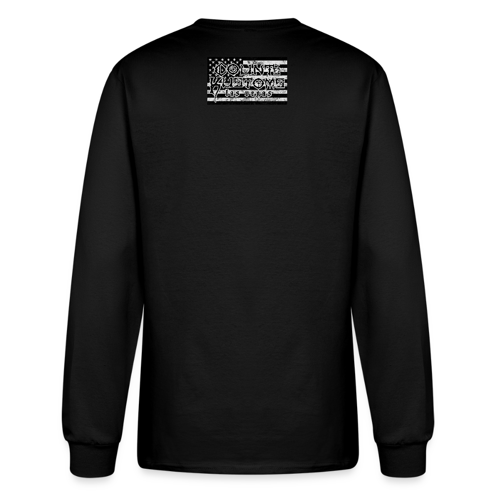 Showcase your allegiance with the Count's Kustoms PATRIOT Long Sleeve T-Shirt. This timeless unisex design in classic black features a striking stars and stripes cross on the front and the iconic Count's Kustoms Flag logo on the back. Made from 100% ring spun cotton, this long sleeve tee offers both lasting comfort and durability, pre-washed to minimize shrinkage. It's not just a shirt—it's a statement of American pride and quality craftsmanship.